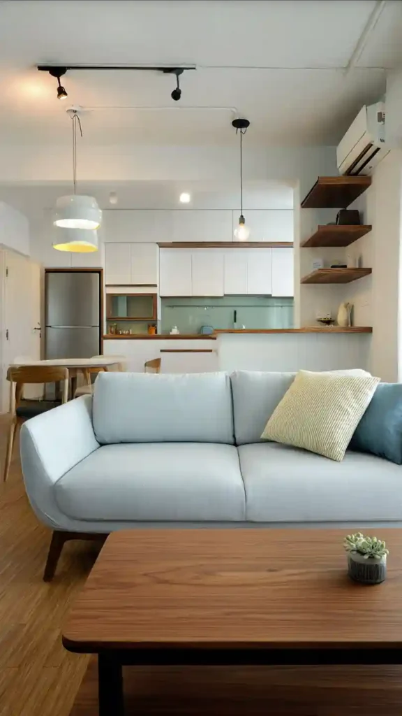 Maximize space by installing a slim, single-wall kitchen. Place a compact loveseat across from the cabinets to clearly define the living area. Choose a round coffee table to improve movement. Mount shelves vertically instead of adding bulky storage. Keep colors light to open up the room visually. This open kitchen and living room layout works because every furniture piece serves a clear purpose.