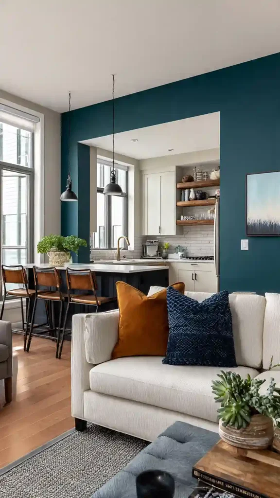 Paint the kitchen island navy or deep green to create a focal point. Repeat the accent shade in throw pillows or artwork. Keep the remaining elements neutral to prevent visual overload. Balance bold color with warm lighting. This open kitchen and living room feels lively because you introduce personality while maintaining harmony.