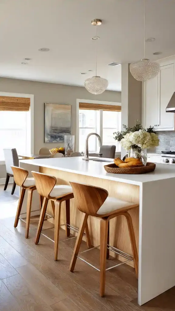 Design this layout with a large white quartz island that anchors the entire space. Use the island to separate the kitchen from the living area without adding walls. Place warm wood bar stools along one side and position a soft neutral sofa across from it. Install simple pendant lights above the island to define the zone. Keep floors consistent to make the open kitchen and living room feel seamless and bright.