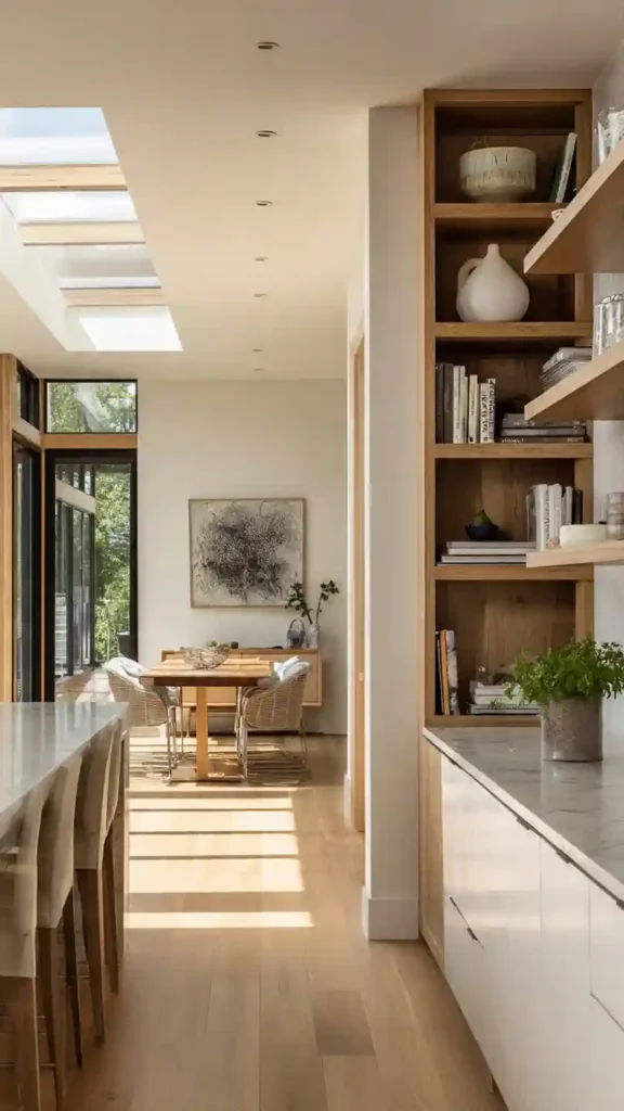 Add built-in shelving along one living room wall to increase storage and character. Style the shelves with books, plants, and neutral decor pieces. Keep the kitchen cabinetry sleek so the shelves become a soft focal point. Position seating nearby to create a cozy reading corner. This open kitchen and living room feels structured because storage doubles as design.