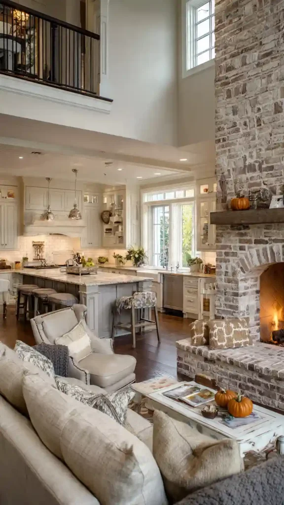Position the sofa to face both the fireplace and the kitchen island. Use stone or brick around the fireplace to add texture. Keep the kitchen finishes simple so the fireplace remains the focal point. Add warm lighting to enhance the cozy mood. This open kitchen and living room feels welcoming because you center the layout around a natural gathering spot.