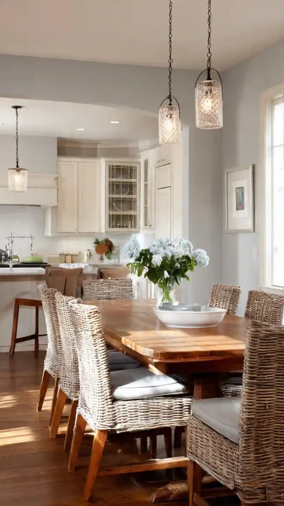Neutral tones like beige, white, soft gray, and warm wood shades create balance and flow. You can introduce a bold accent through an island color or decor pieces. Make sure you repeat that accent shade in both areas to maintain harmony. Avoid using too many contrasting colors, as that can break the visual connection.