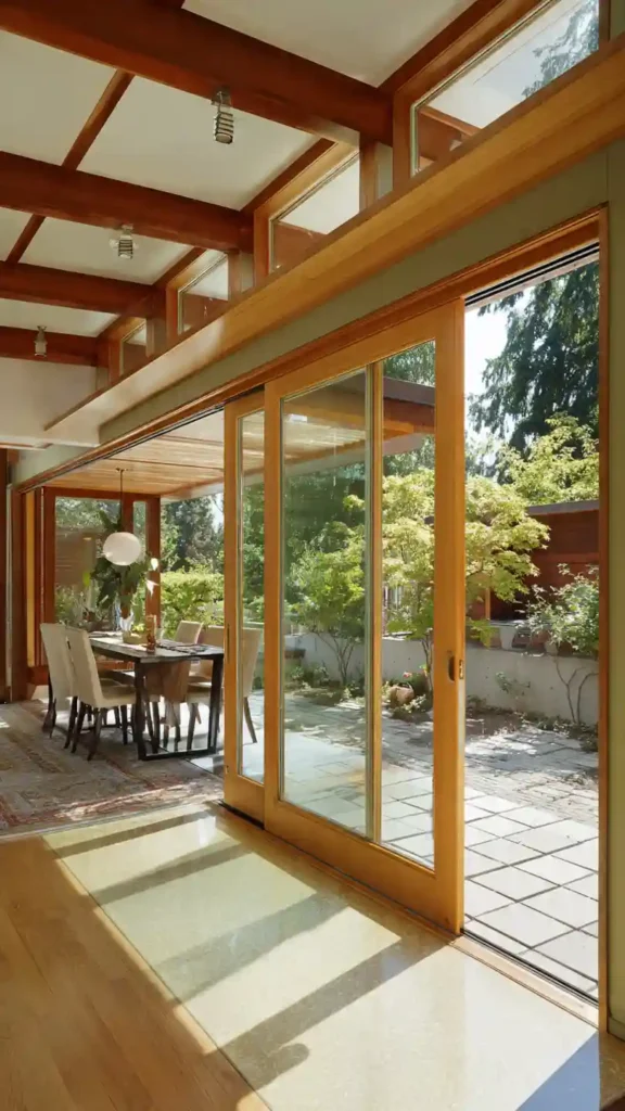 Install wide sliding glass doors to connect the interior with the patio. Arrange the sofa to face both the kitchen and outdoor view. Keep indoor and outdoor color palettes similar for continuity. Use light curtains that move easily with airflow. This open kitchen and living room feels larger because you visually extend the space beyond the walls.