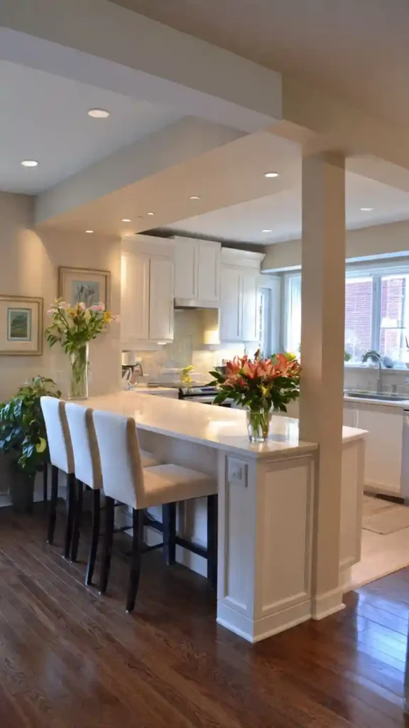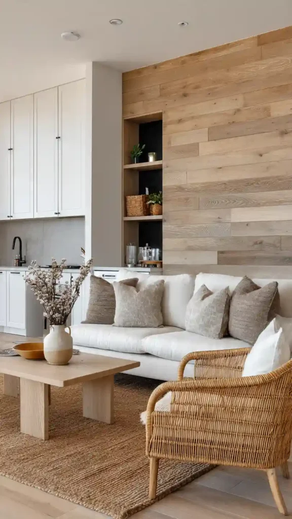 Install a vertical wood accent wall behind the sofa to warm up the entire layout. Pair it with clean white kitchen cabinets for contrast. Add natural decor like rattan chairs or ceramic pieces to enhance texture. Keep lighting soft to highlight the wood grain. This open kitchen and living room feels inviting because you introduce warmth without overwhelming the space.