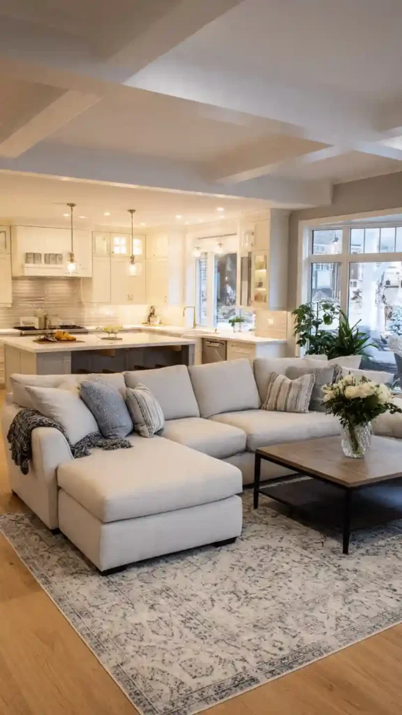 Use an L-shaped sectional to clearly anchor the living area. Position the back of the sofa toward the kitchen to create a natural boundary. Add a large rug underneath to visually secure the seating zone. Keep the island parallel to the sofa for balance. This open kitchen and living room flows smoothly because furniture placement guides movement without interrupting openness.