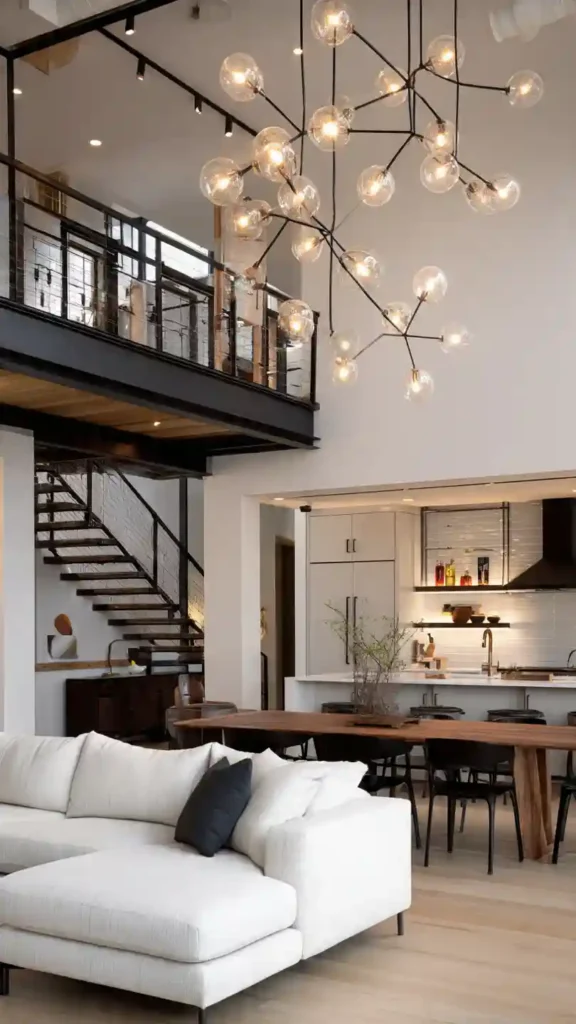 Install oversized pendant lights above the island to define the kitchen zone. Add a sculptural chandelier in the living area to balance the layout. Use warm lighting to soften the openness. Keep surrounding decor simple so lighting stands out. This open kitchen and living room feels elevated because you use lighting as a design feature, not just a necessity.