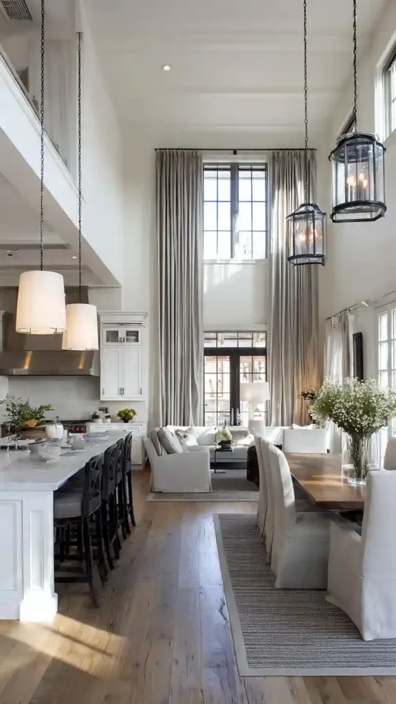 Draw attention upward by adding tall curtains and statement pendant lights. Use slightly larger furniture to fill vertical space properly. Keep colors light so the ceiling height feels airy rather than heavy. Arrange seating to maintain openness beneath the tall structure. This open kitchen and living room feels expansive because you design around height instead of ignoring it.