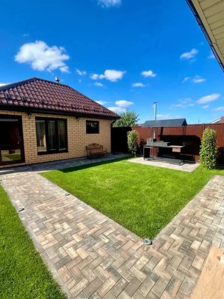 What makes this design stand out is the crisp edge where the pavers meet the lawn. That sharp contrast between green grass and neutral stone gives the whole space a clean, finished look without needing extra decoration.