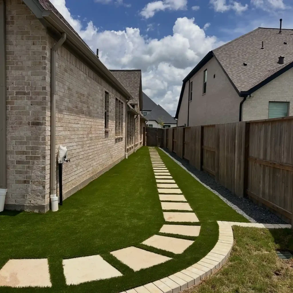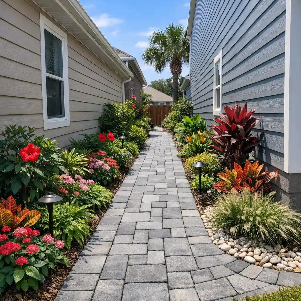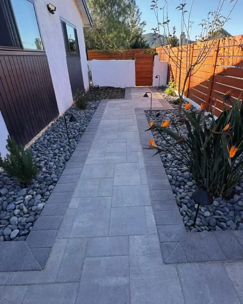 This design turns a tight side yard into something clean and functional. Small rectangular pavers are laid in a simple pattern, with river rocks on both sides adding texture and helping with drainage.