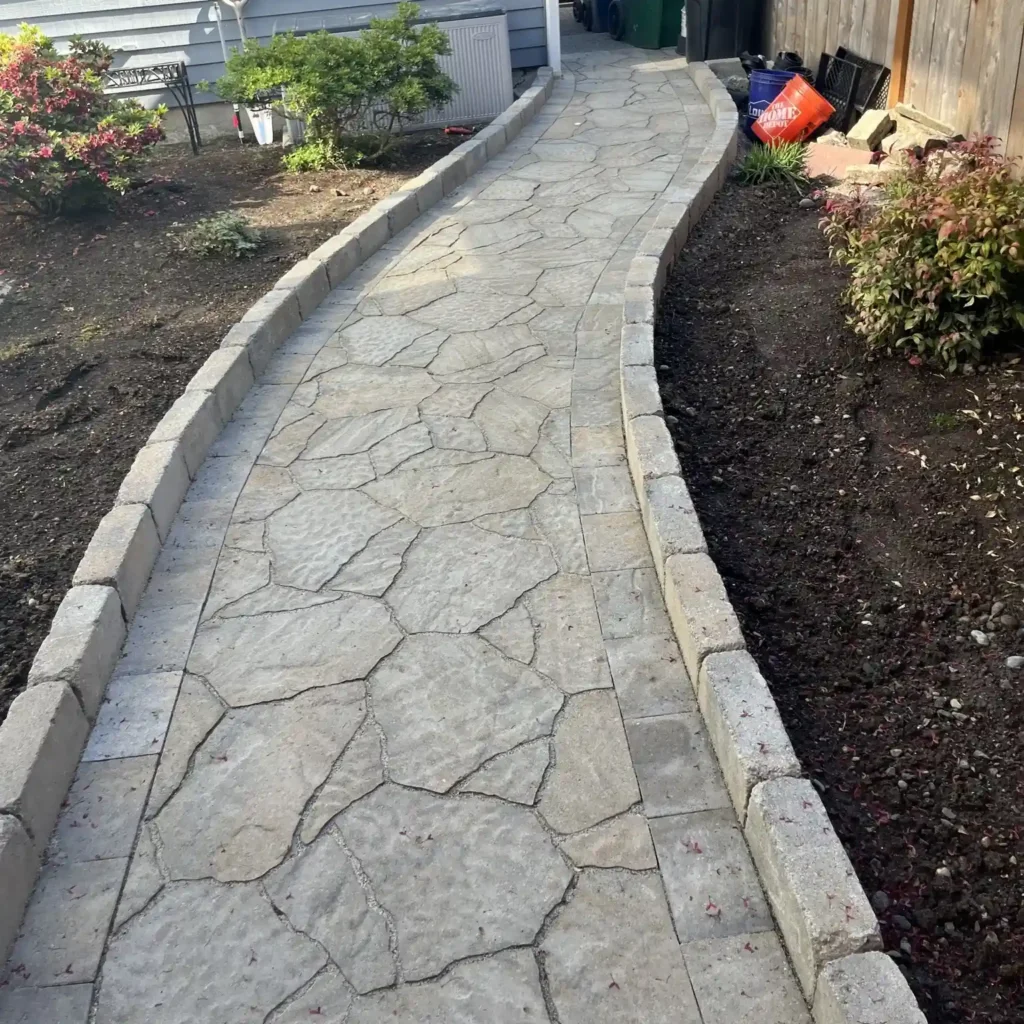 This walkway has a soft, flowing shape that instantly makes the space feel more inviting. The stone-style pavers mimic natural textures, while the raised edges keep everything neatly contained.