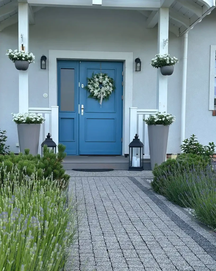 The clean layout, paired with soft greenery, creates a peaceful and welcoming entrance. Small details like lanterns and matching pots make the space feel thoughtfully styled without adding clutter.
