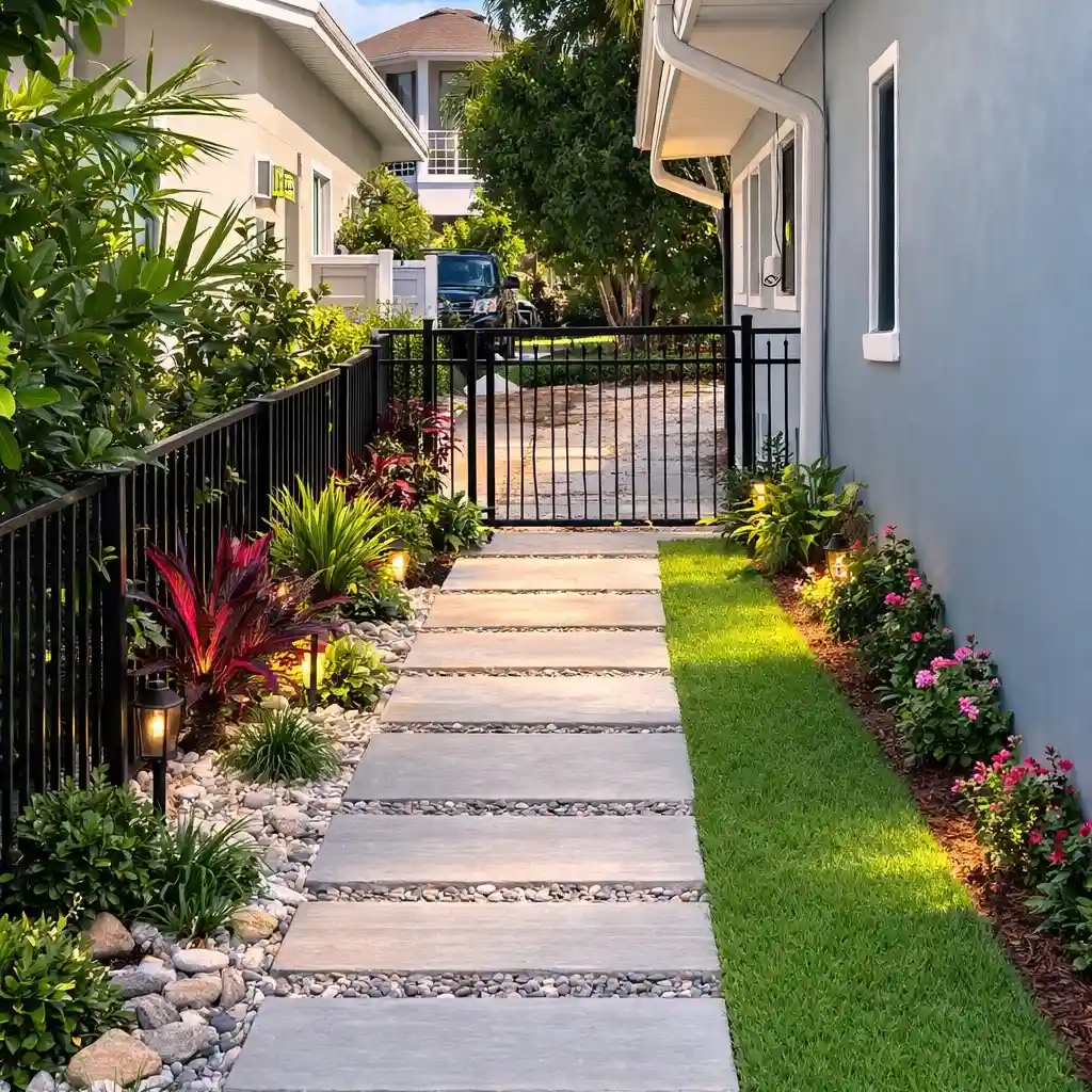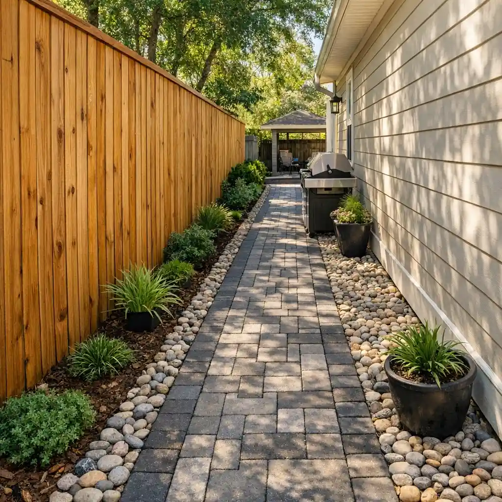 The narrow layout stays practical, while the combination of pavers and stones keeps it from looking dull. A few small plants or pots along the edge make the space feel more finished without crowding it.
