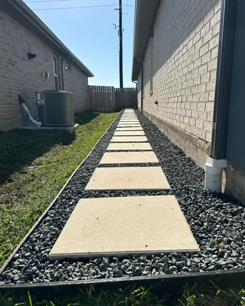 Side yards are often ignored, but this setup proves they can look just as good as the front. Large square stepping stones are evenly spaced over dark gravel, turning a narrow area into something functional and tidy.