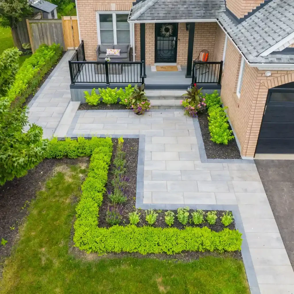 What stands out here is how the walkway connects different areas—the porch, garden beds, and lawn—without feeling disconnected. The sharp edges paired with neatly trimmed hedges make everything look intentional and organized.