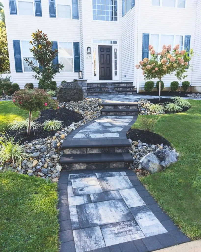 This walkway adds depth and character by working with different levels. Instead of a flat path, it uses gentle steps to guide you upward, making the entrance feel more dynamic and visually interesting.