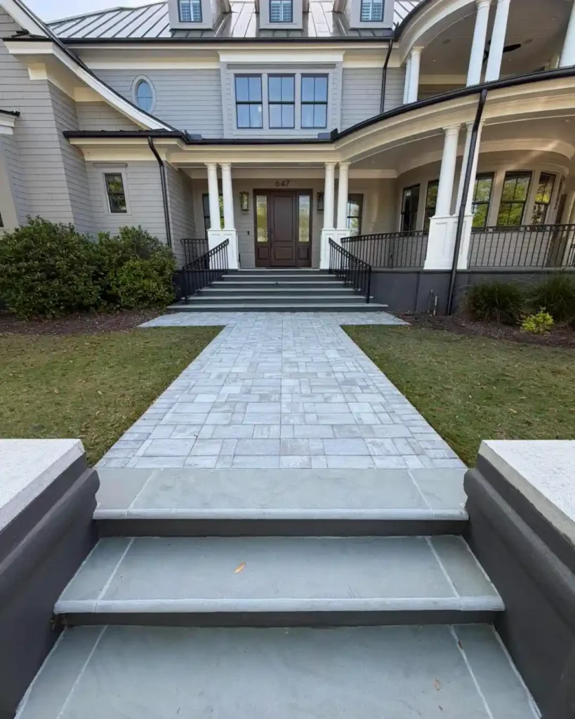 This walkway feels grand and welcoming the moment you see it. Wide pavers lead straight to the entrance, paired with clean steps that create a smooth transition from yard to porch.