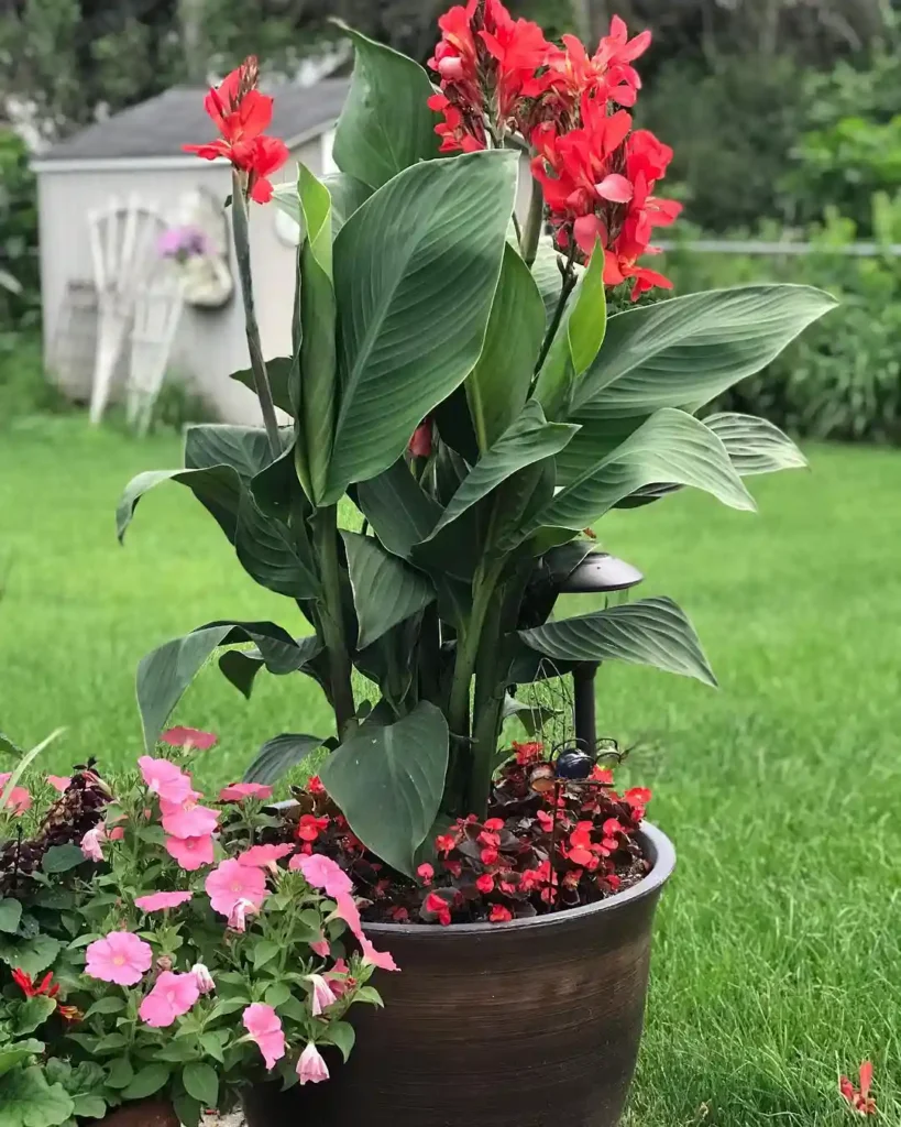 Canna lilies bring a lush, bold look with their large leaves and bright flowers. They instantly make a space feel more tropical and lively. These plants love sunlight and need regular watering, especially in warm weather. If you want something that adds both height and strong visual impact, canna lilies are a great pick.