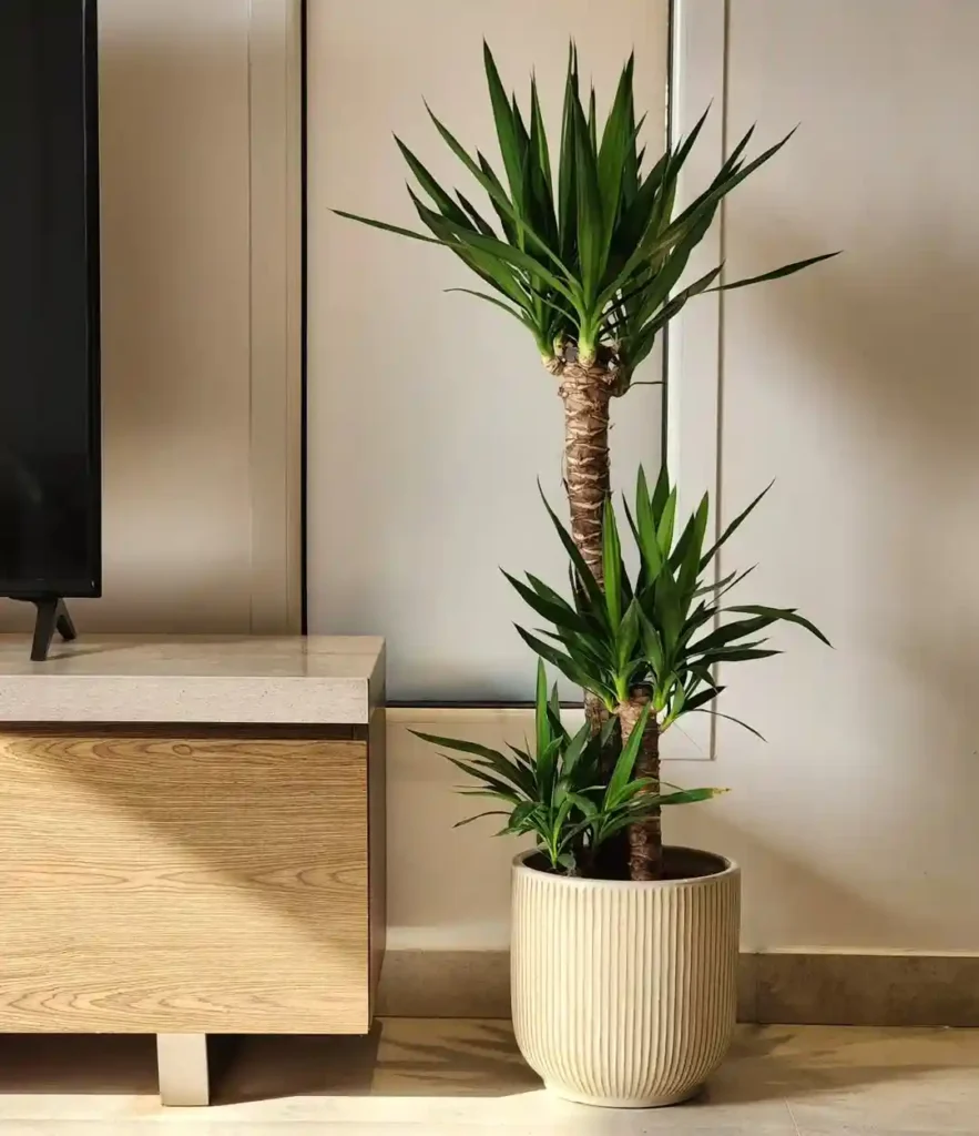 Yucca plants add height and structure, which helps create a more layered and styled look in container gardens. Their spiky leaves grow upward, making them perfect for corners or as a centerpiece. They handle strong sunlight easily and don’t require constant watering. This makes them a great option if you want something visually strong but easy to manage.