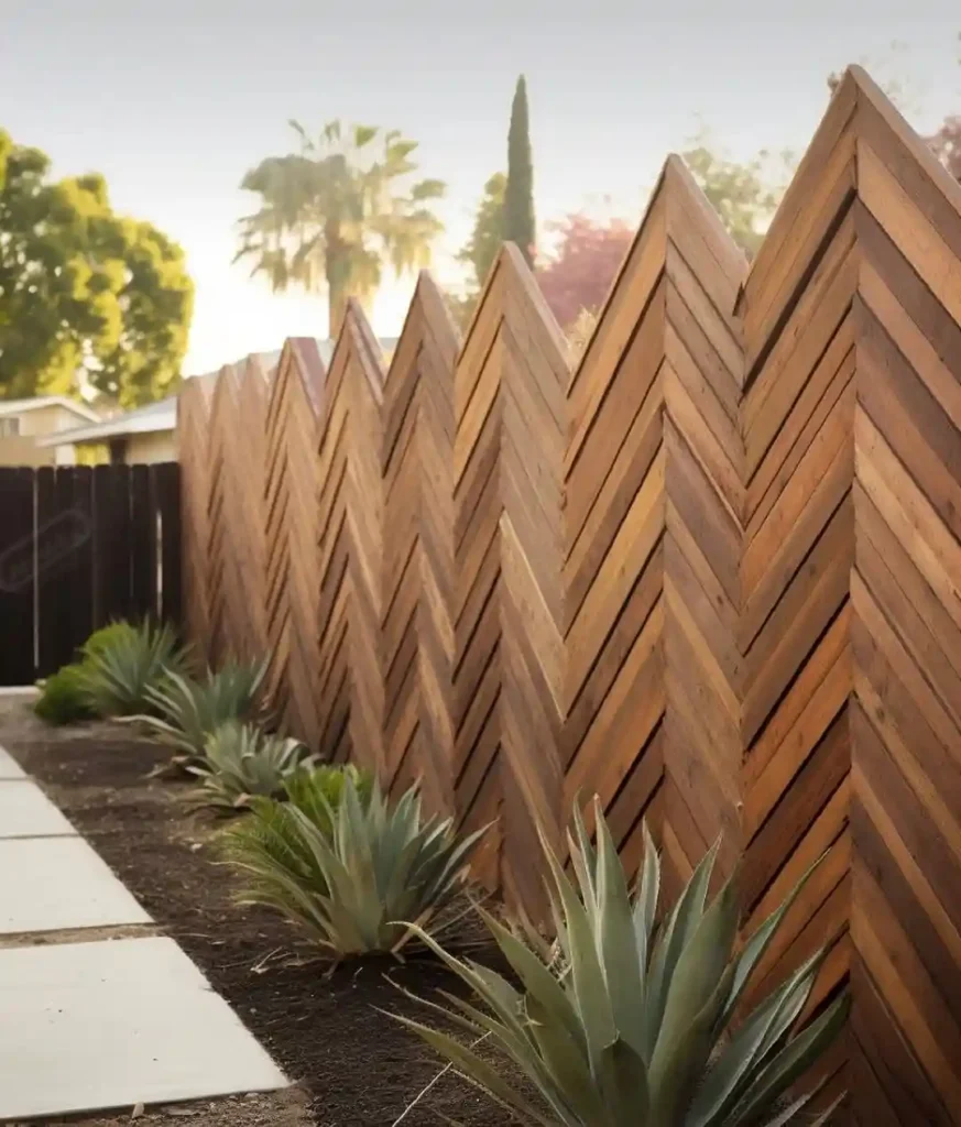 This is one of the most eye-catching designs in the entire list. The angled wood pattern creates movement, so even a simple fence feels like a design statement. The warm wood tones and repeating zigzag pattern make the space feel custom-built rather than standard. It works especially well in modern or mid-century style homes.