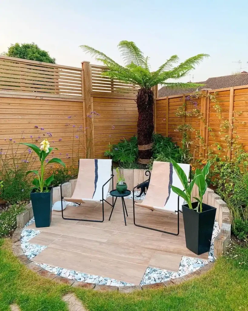 This setup feels like a hidden retreat right inside your backyard. The warm horizontal wood fencing wraps around the space, creating a calm, enclosed vibe. Paired with simple lounge chairs, potted plants, and soft textures, it turns a small corner into a relaxing hangout spot. The natural wood tone blends beautifully with greenery, making everything feel grounded and inviting.