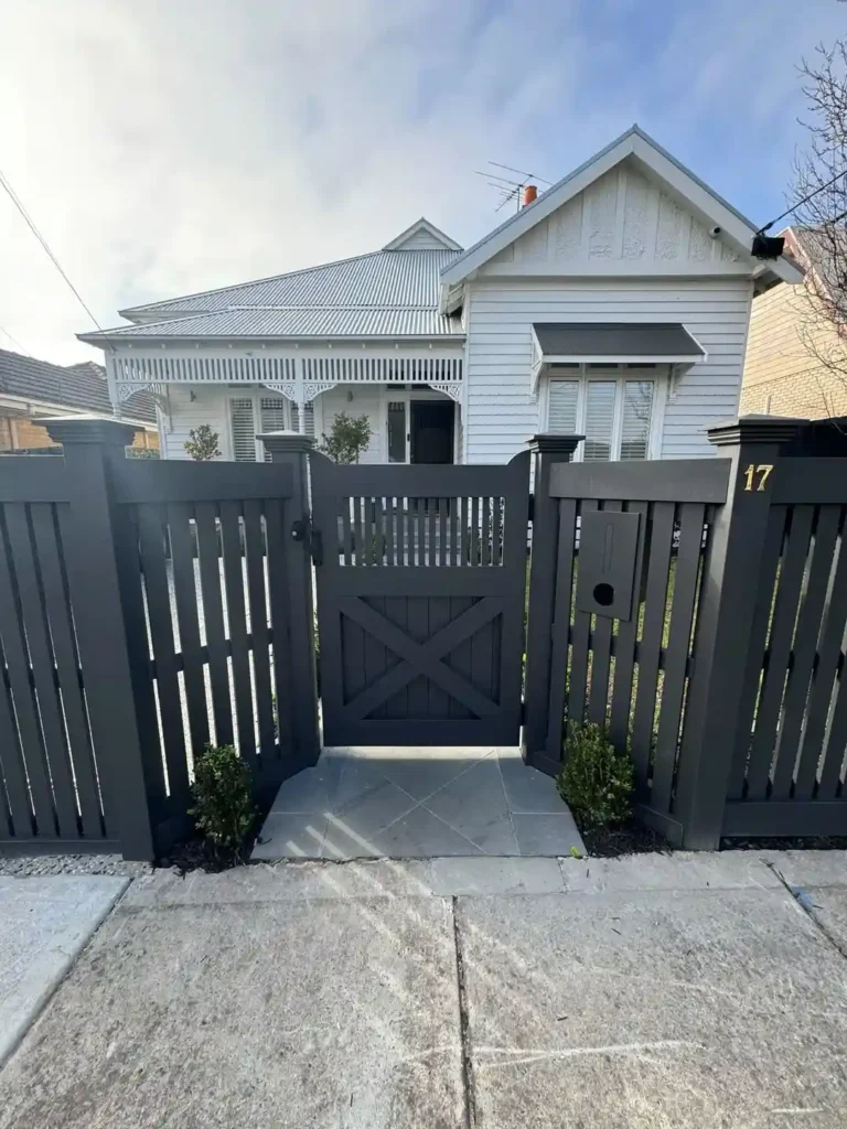 This design is bold and clean, especially against a light-colored home. The dark vertical slats create strong privacy, while the centered gate with cross detail adds character. It feels secure but still stylish, almost like a front entrance feature rather than just a boundary. The symmetry and sharp lines make the whole exterior look more finished.