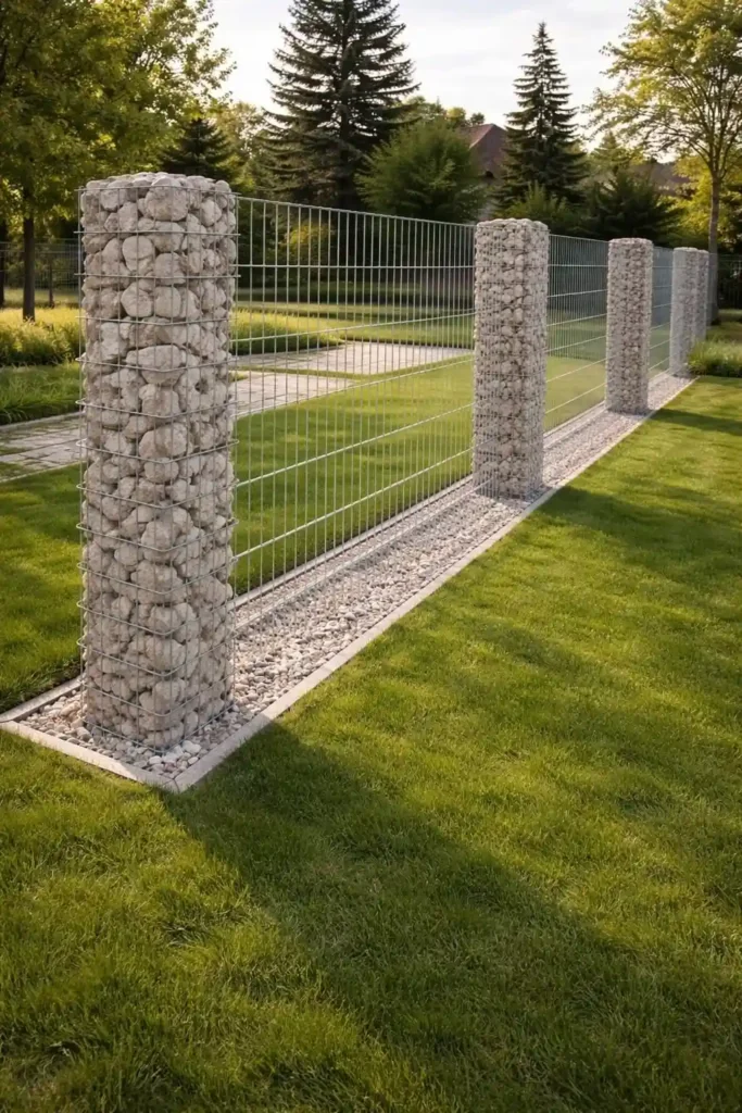 This fence feels strong and architectural without looking heavy. The stone-filled columns give it a solid, grounded look, while the metal wire panels in between keep the space open and breathable. It’s a great choice if you want durability but don’t like the boxed-in feel of full wooden fences. The mix of textures—stone, metal, and greenery—adds instant depth to the yard.