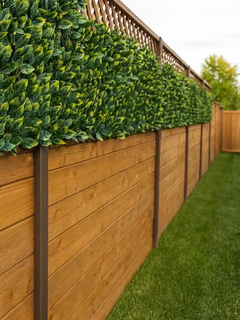 This fence design feels rich and well thought out, not just functional. The horizontal wood panels give strong privacy, while the top layer of dense greenery softens the look and adds life. It’s a smart way to avoid that flat, boxed-in feeling your fence becomes part of the landscape instead of just a barrier. The contrast between warm wood tones and fresh green leaves makes the whole yard feel more inviting.