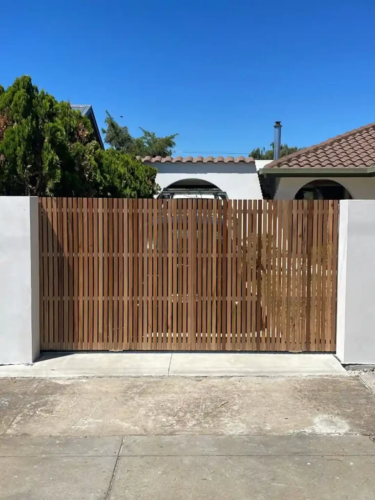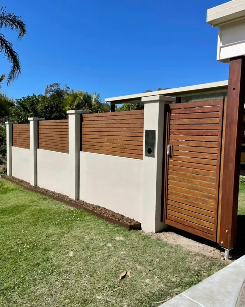 This final design feels high-end and structured. The mix of smooth concrete columns and horizontal wood slats creates a strong, balanced look. The matching gate ties everything together, making the whole boundary feel intentional instead of pieced together. It offers full privacy while still looking sleek and modern from the outside.