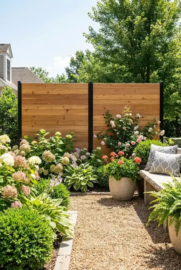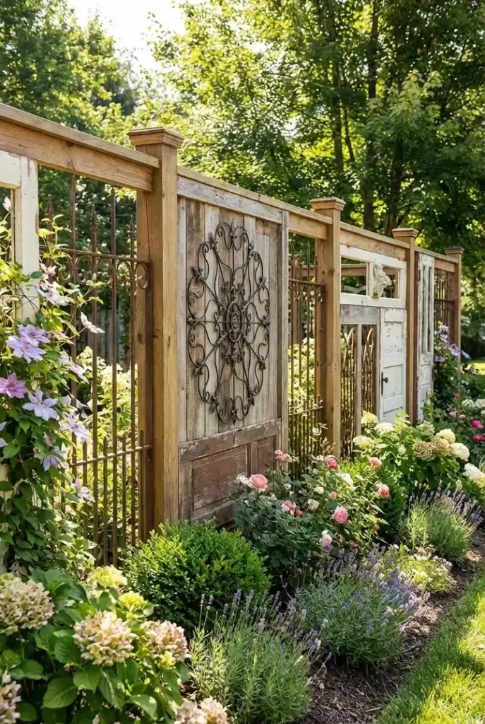 This fence stands out because it mixes wood panels with decorative metal sections, giving it a slightly vintage, handcrafted feel. It doesn’t just create privacy it becomes part of the garden design itself. Surrounded by blooming flowers and soft greenery, the fence acts like a backdrop that enhances everything in front of it rather than hiding it.