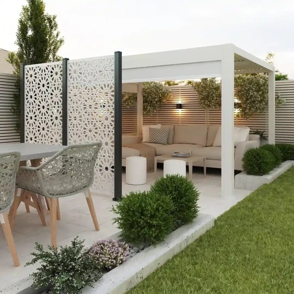This is more than just a fence it’s a full outdoor living zone. The combination of a pergola, horizontal slat fencing, and patterned privacy screens creates layers of separation without closing the space off completely. The neutral tones, soft seating, and built-in greenery make it feel like an extension of your indoor living room.