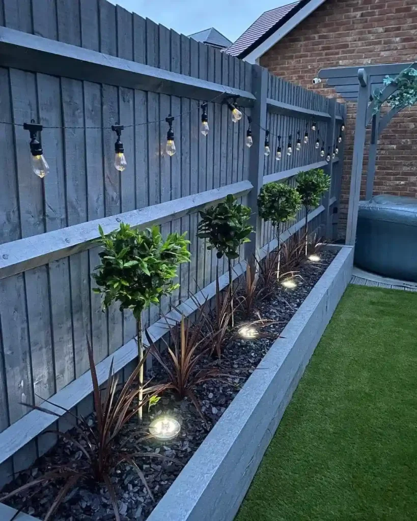 This setup turns a basic fence into a full backyard feature. The painted wood panels look fresh and modern, while the string lights and built-in planter bed add warmth and personality. At night, the lighting creates a cozy vibe that makes the space feel like an outdoor living room.