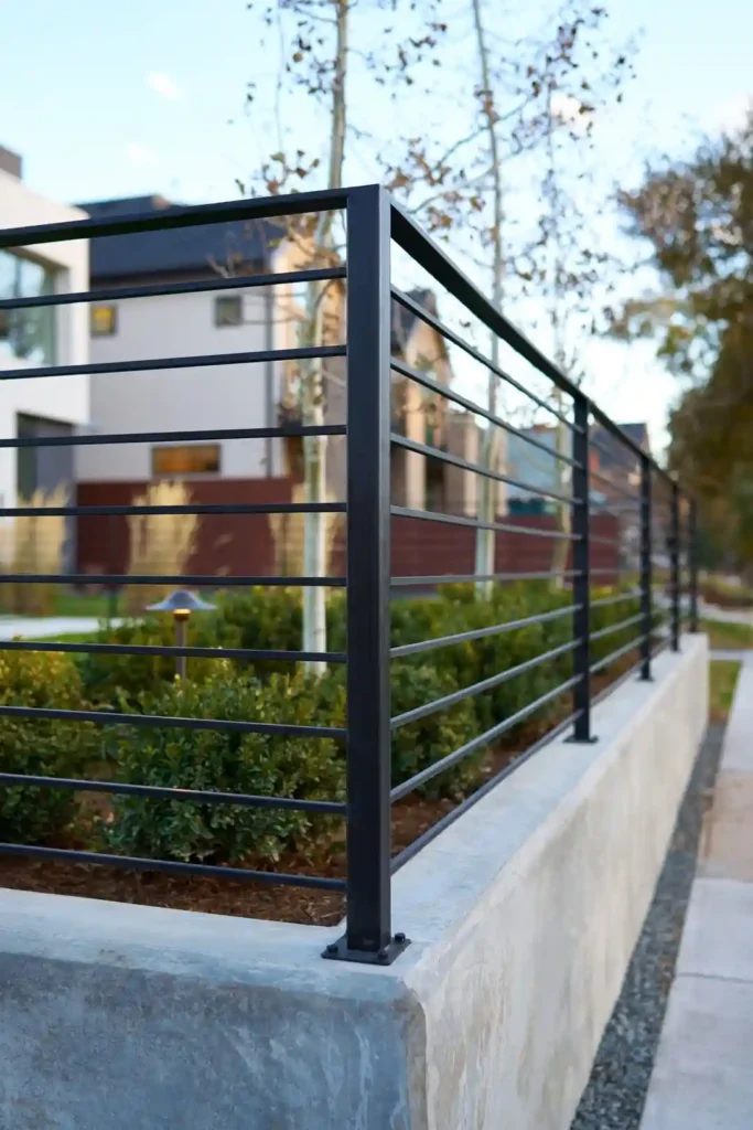This fence is all about clean lines and a modern feel. The slim horizontal metal rails keep the space open while still defining the boundary clearly. It works best in contemporary homes where you don’t want to block views but still need structure. The dark finish contrasts nicely with greenery and concrete, giving the whole area a sharp, polished look.
