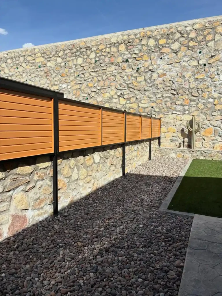 This design mixes heavy and light elements in a really smart way. The solid stone wall gives strong privacy at the base, while the horizontal slat panels above keep things from feeling too closed off. It works especially well in hot, dry landscapes where stone blends naturally with the surroundings. The contrast between rough stone and smooth slats adds depth without needing extra decoration.