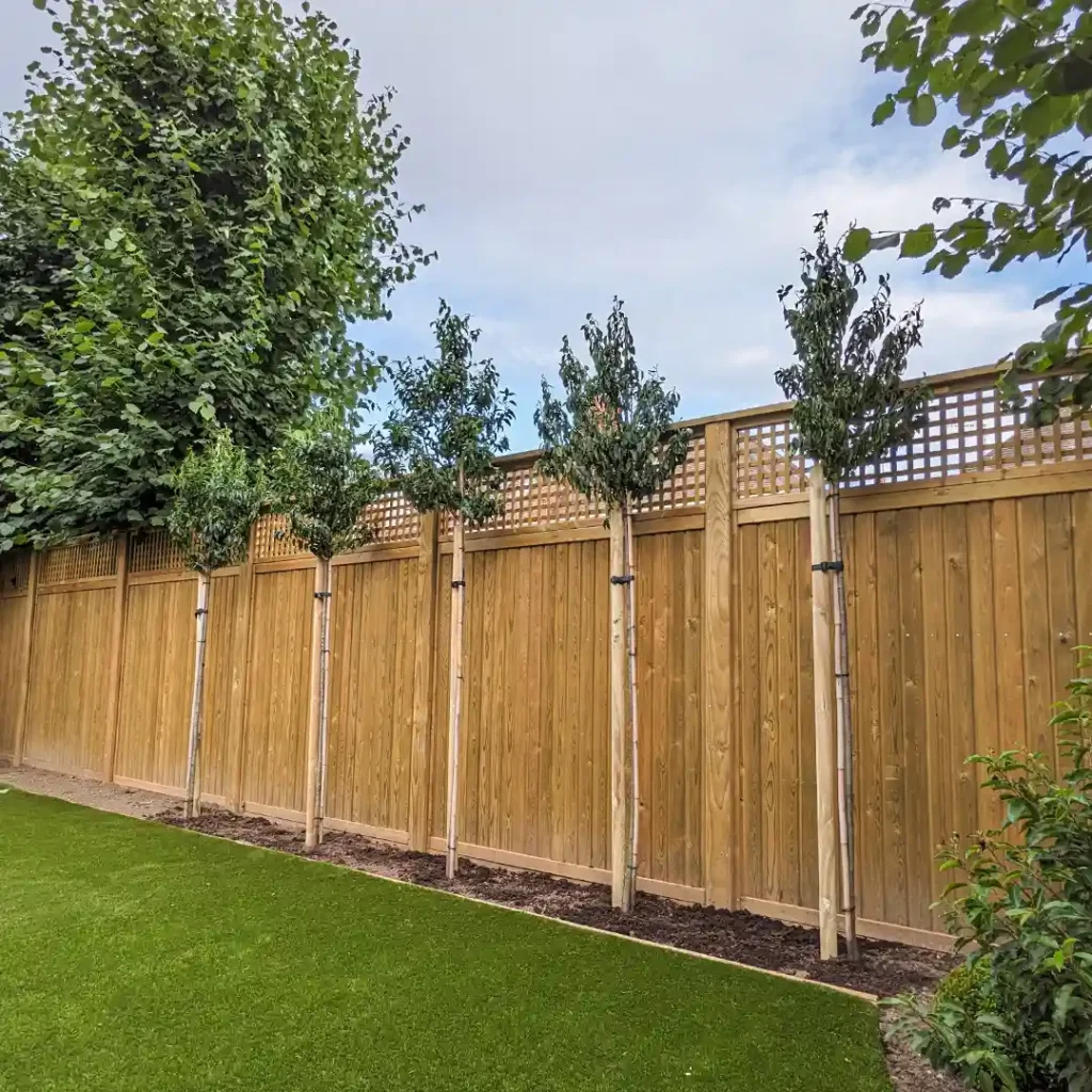This fence strikes a really smart balance between full privacy and visual lightness. The solid vertical wood panels give you complete coverage, while the lattice strip along the top keeps it from feeling too heavy. Paired with evenly spaced young trees, the whole setup looks structured and clean, almost like a landscaped boundary rather than just a fence.
