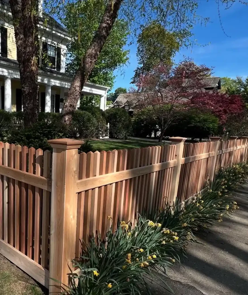 This fence brings a softer, more open feel compared to full privacy styles. The pointed pickets create a clear boundary without blocking views, making it ideal for front yards or garden edges. Surrounded by flowers and greenery, it feels warm and welcoming rather than restrictive. It’s not about full privacy it’s about defining space beautifully.