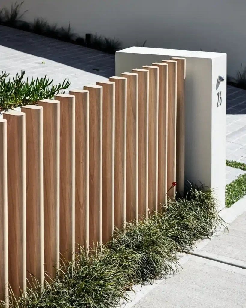 This design feels more like a statement piece than a basic fence. The rounded vertical wood slats create rhythm and texture, almost like a sculptural wall. Paired with concrete and minimal planting, it gives off a very modern, high-end feel. It’s perfect for front yards or small sections where you want privacy but also want the design to stand out.