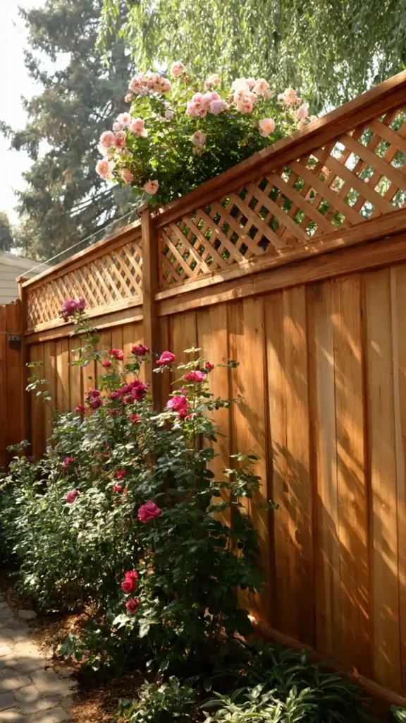 This fence blends structure with softness perfectly. The solid wood panels provide privacy, while the lattice top allows light and climbing plants to weave through. The roses growing alongside add color and a relaxed garden feel, making the fence look like part of the landscape rather than a barrier.