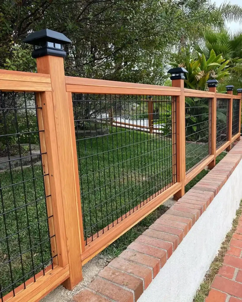 This fence is a great mix of openness and security. The wooden frame keeps it warm and natural, while the wire panels give visibility and airflow. It’s perfect if you don’t want a completely closed-off yard but still need a clear boundary. The small solar lights on top are a nice touch, adding function without clutter.