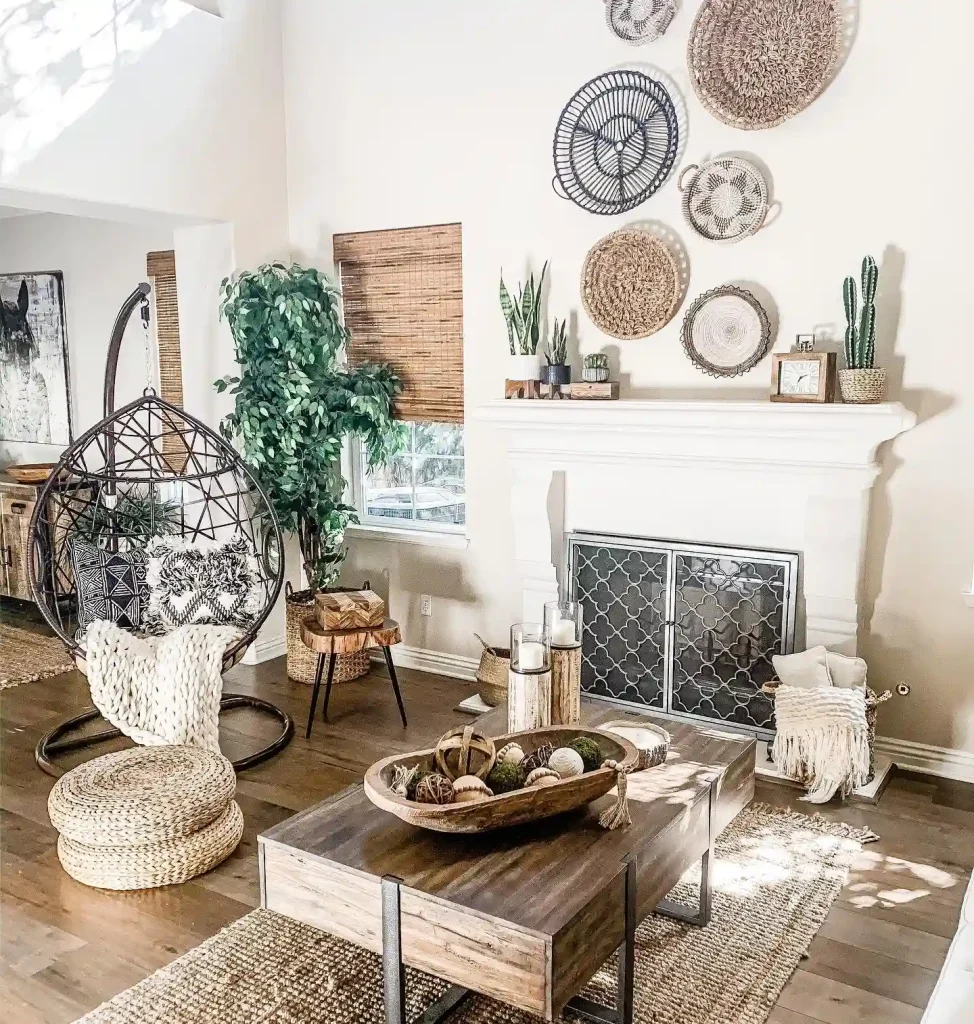 The neutral color palette is enriched with woven wall baskets, wood accents, and natural fibers. A cozy fireplace serves as a focal point, while layered rugs and a chunky knit throw add warmth.