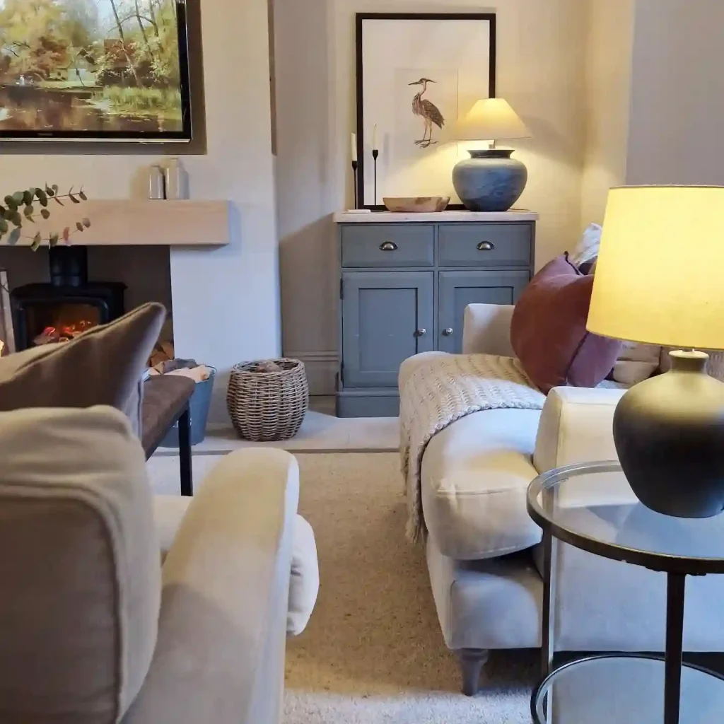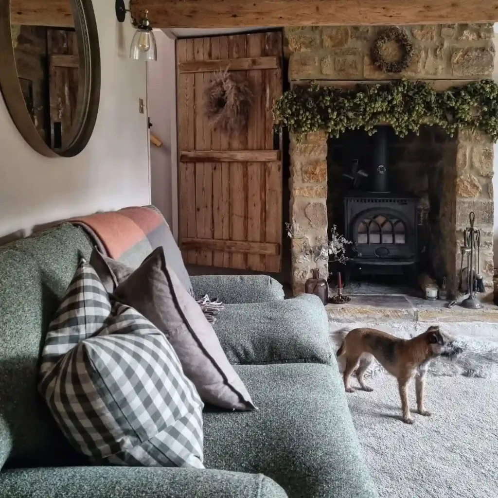 This living room captures the essence of a traditional English cottage, with a wood-burning stove adding warmth and authenticity.
