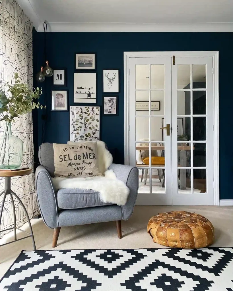 The deep navy walls create a striking contrast, making the space feel bold yet cozy. French doors allow natural light to filter in, softening the dark tones.