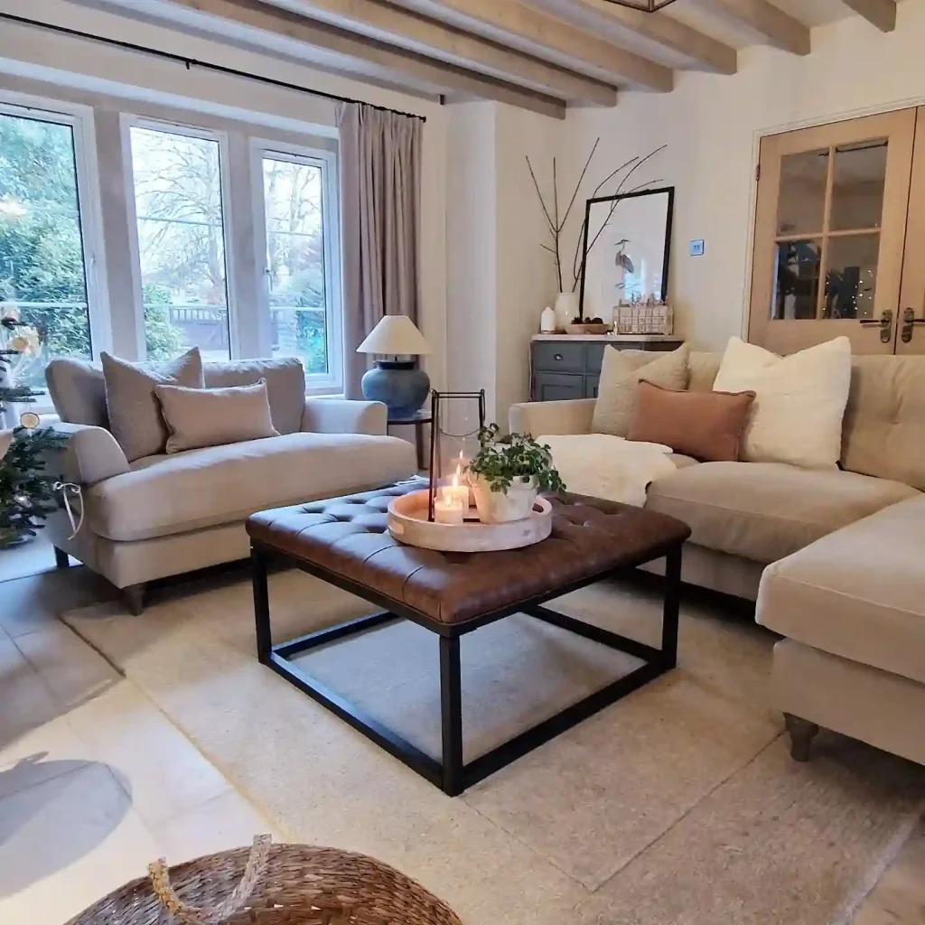 A tufted leather ottoman acts as a statement piece, bringing both style and function. Woven accents, plush throws, and subtle greenery enhance the cozy, farmhouse-inspired aesthetic.