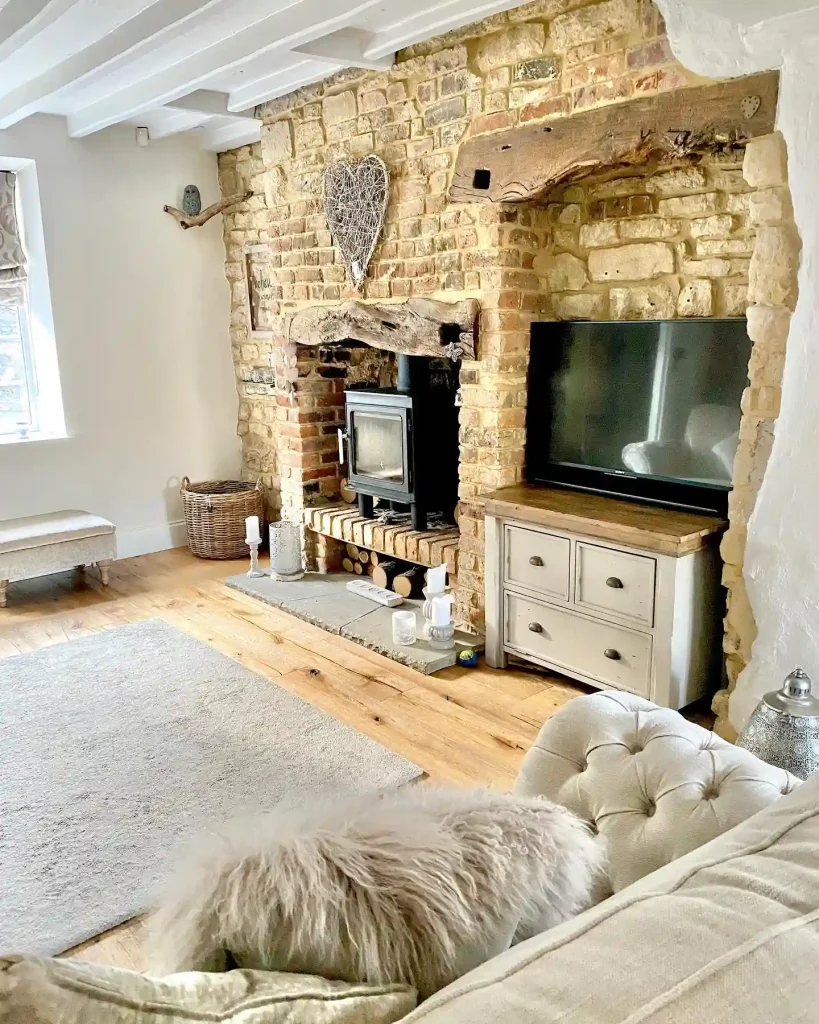 Nothing exudes rustic charm like an exposed brick fireplace paired with natural wooden beams.