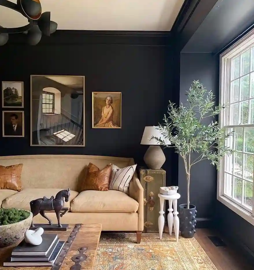 For lovers of vintage rustic aesthetics, this living room is a dream. Black walls provide an elegant backdrop for a beige sofa and antique-style décor.
