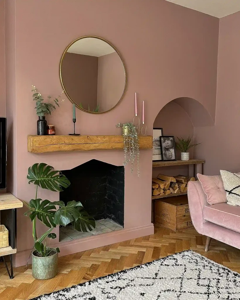 11. Warm Blush-Toned Rustic Living Room with a Modern Touch