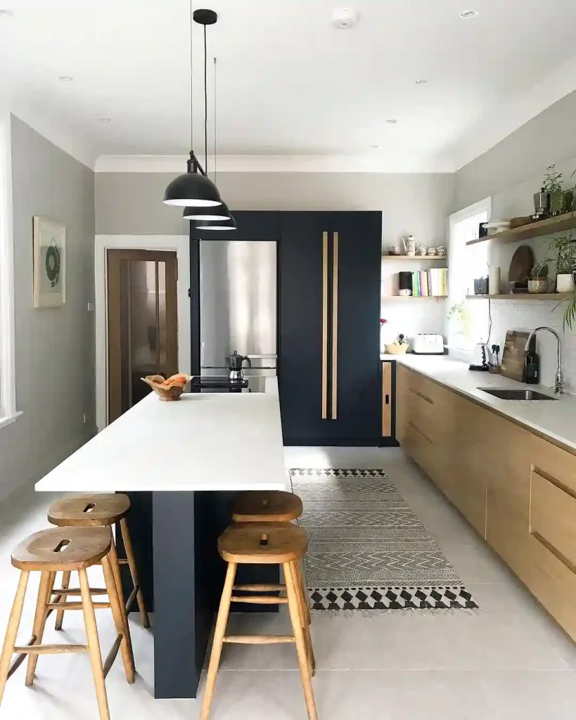 This kitchen combines modern and rustic with style. The deep navy cabinets and island legs create a bold contrast with the light wood drawers and stools. Clean lines, matte finishes, and black pendant lights add a sleek touch. The patterned rug softens the floor and brings a cozy layer underfoot. This space proves you can be minimal without being boring—it feels both grounded and fresh.
