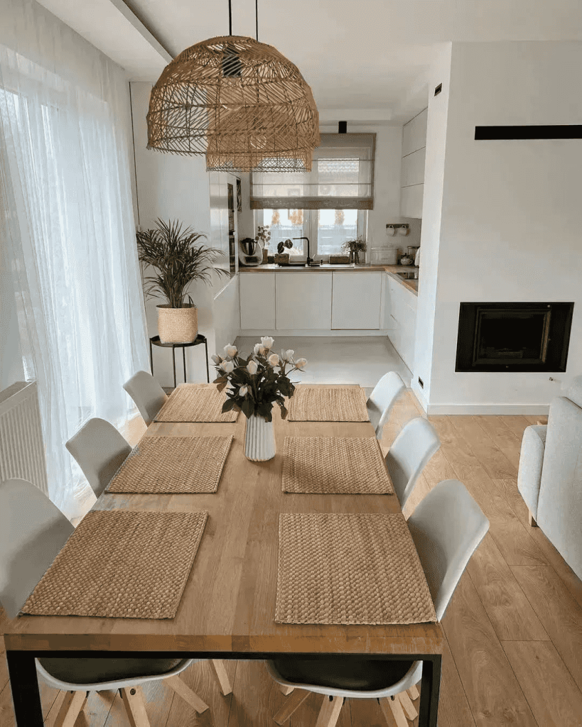 This kitchen and dining setup is clean and organized, yet warm and welcoming. The wooden dining table anchors the space with woven placemats adding texture. The large rattan light fixture above ties the look together, giving it a natural and relaxed charm. Floor-to-ceiling curtains bring softness, and the subtle greenery makes the room feel alive. It’s a great example of how minimalism doesn’t have to feel cold.