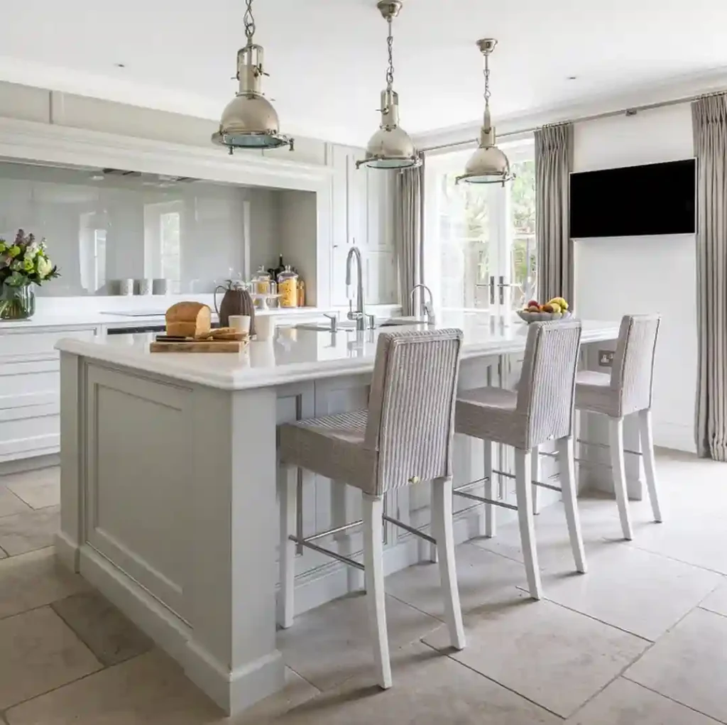 This kitchen brings a peaceful vibe with its soft grey tones, clean lines, and natural light. The shaker-style island with a glossy white countertop adds charm and function. Those woven bar stools bring in that cozy, handmade feel that Scandinavian design is known for. Metal pendant lights give the space a balanced look—stylish yet simple. It’s a kitchen that feels open, bright, and ready for both quiet coffee mornings and family dinners.