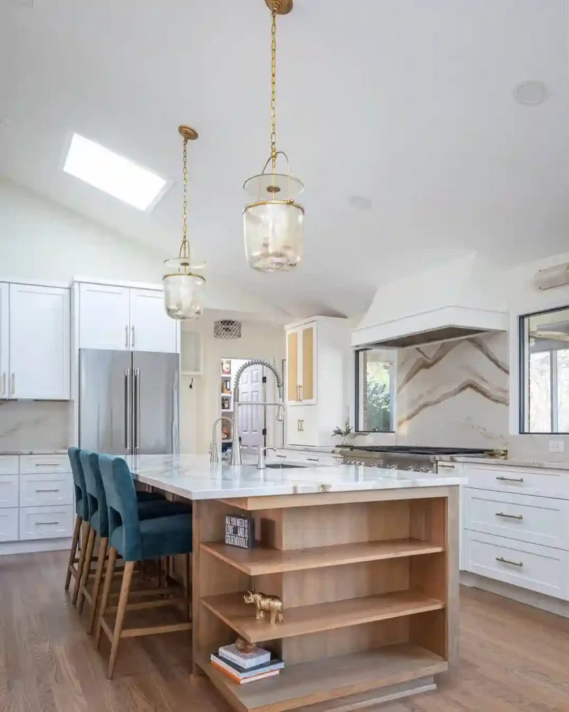 This kitchen blends clean Scandinavian lines with a hint of luxury. The marble island with wood shelving gives off a practical yet polished vibe. Gold fixtures and pendant lights add a bit of shine without being too flashy. The blue velvet bar stools bring in color without overwhelming the neutral palette. Everything about this kitchen feels fresh, airy, and just the right amount of cozy and chic.