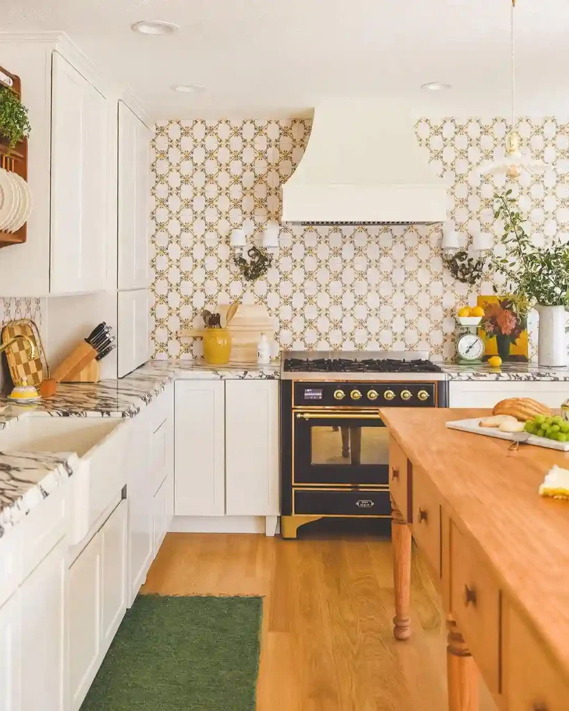 This kitchen steps out of the usual all-white box with playful patterned wallpaper and a vintage-style black stove. The Scandinavian roots show through in the simplicity of the white cabinets and natural wood island. Marble countertops add elegance, while pops of yellow keep it cheerful. It’s a space that feels curated, like a warm memory with modern convenience.